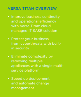 Titan is underpinned by the market-leading Versa Operating System (VOS), making it easy-to-deploy as a cloud managed SASE solution. Versa Titan provides organisations with an ability to accelerate business growth and to ease any deployment and execute administration. Versa Titan incorporates multiple access types, automated multi-path site-to-site VPN, direct internet breakout to any application or user, and dynamic application prioritisation.